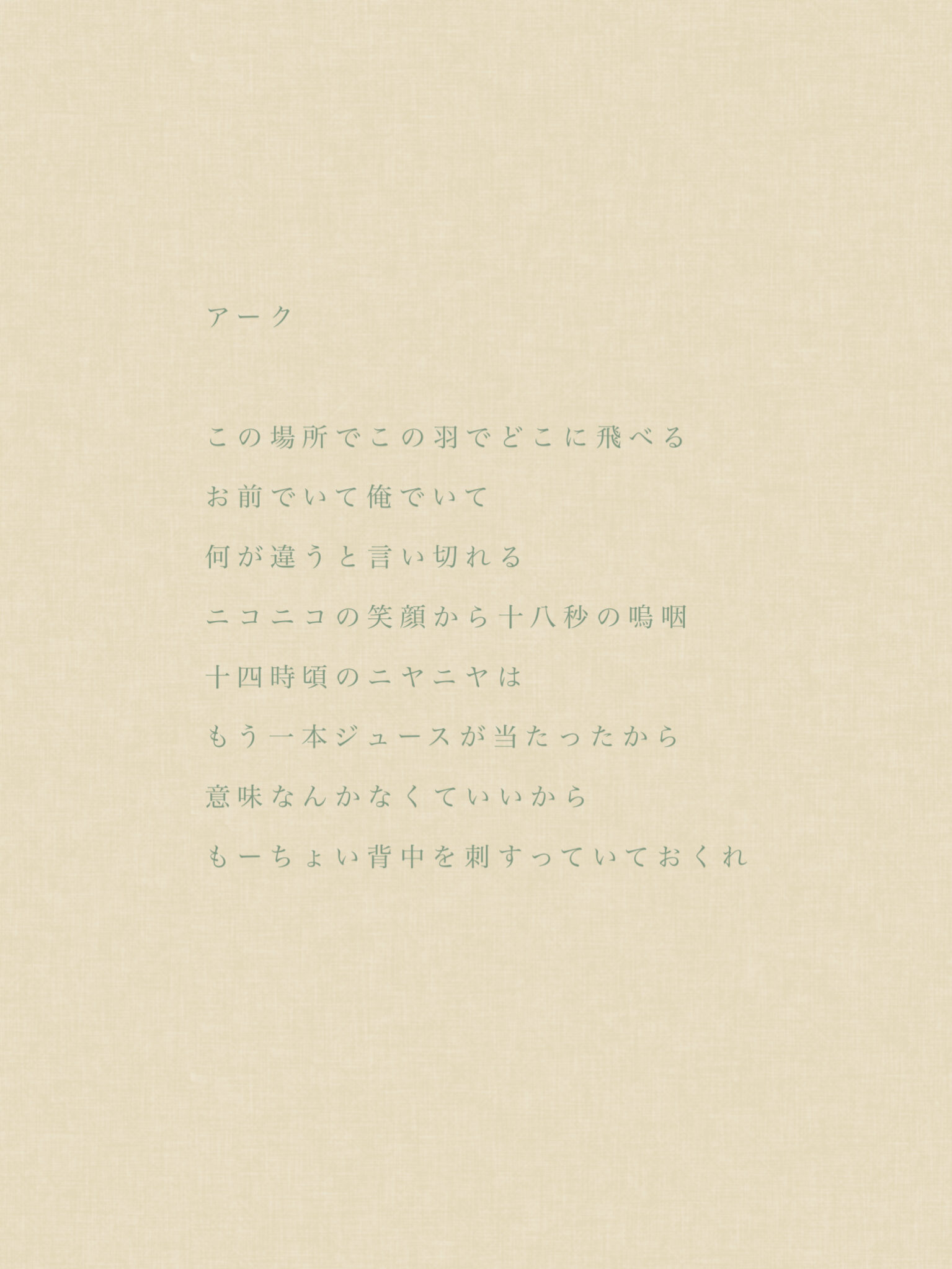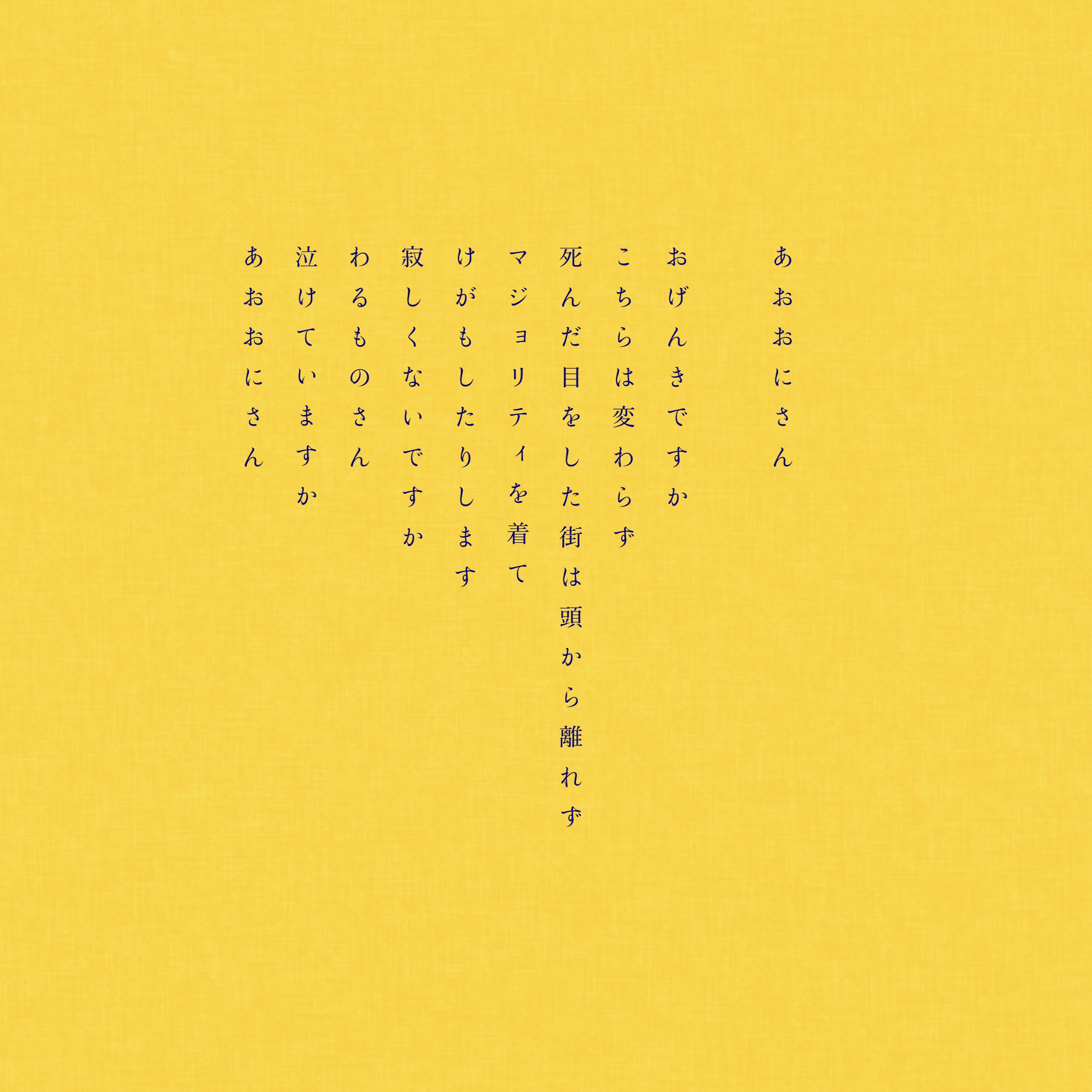 GALLERY 透明の瓶 ふえてきて koi 5→6 おくる うそとかみひこうき あおとくろ ないてしまった あおおにさん つたえきれない きいてくれるのは アーク さいきんのこと スナッファー あおい詩しゅう つい 消えない 春すぎて will tulip はるかぜ relation